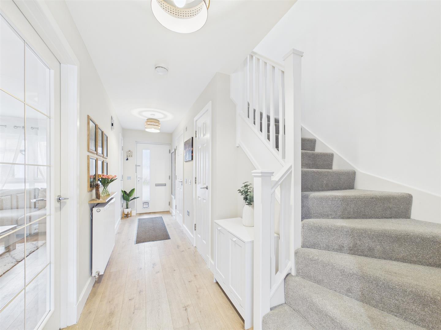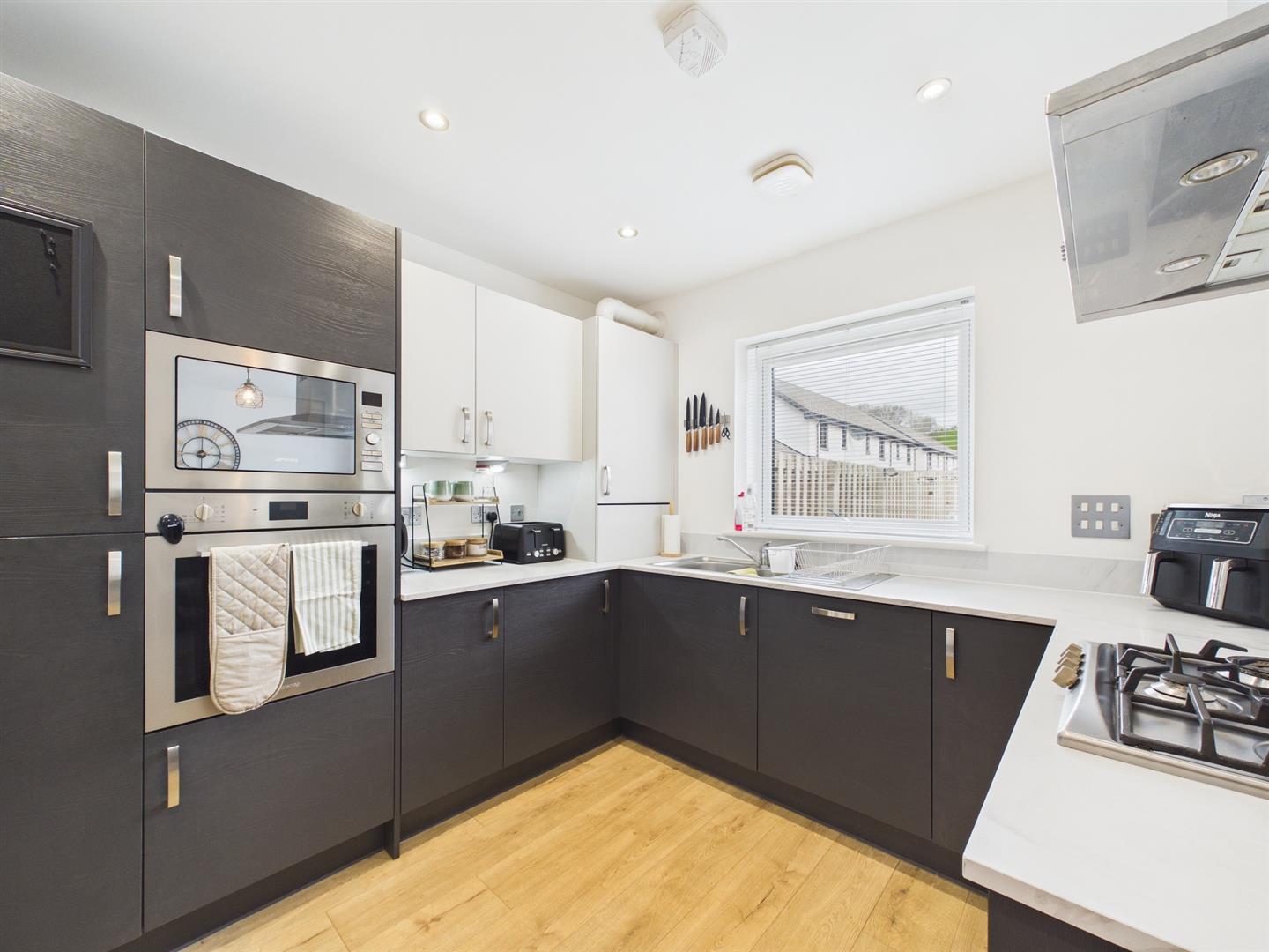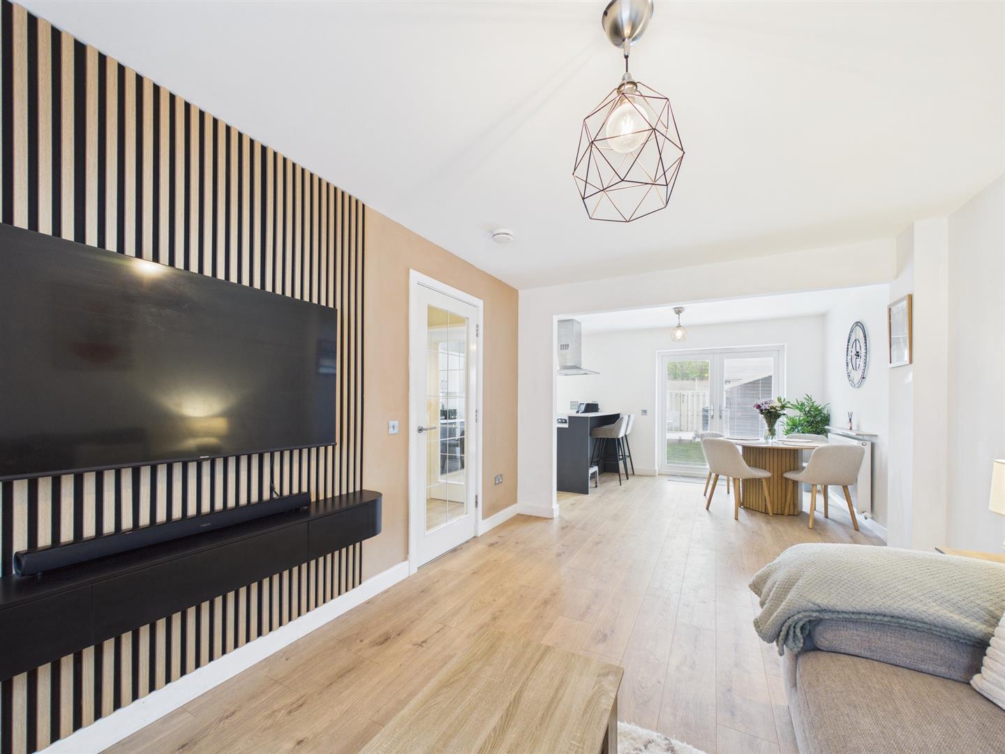 This beautifully presented three-bedroom semi-detached home offers stylish and modern accommodation, ideal for families, first-time buyers or those seeking a move-in ready property within a popular residential development.The ground floor features a bright and spacious open-plan kitchen and living area, forming the heart of the home. The contemporary kitchen is fitted with sleek units, integrated appliances and ample worktop space, while the living area provides a comfortable setting for relaxing and entertaining, with direct access to the rear garden via patio doors. A convenient WC is also located on this level. Upstairs, the property offers three well-proportioned bedrooms, including a generous principal bedroom and two further rooms suitable for family living, guests or home working. The modern family bathroom is finished to a high standard with a shower over bath. Externally, the property benefits from a private, enclosed rear garden with lawn and decking area, ideal for outdoor dining and leisure. To the front, there is a driveway providing off-street parking. This attractive home combines modern design with practical living space in a sought-after location.