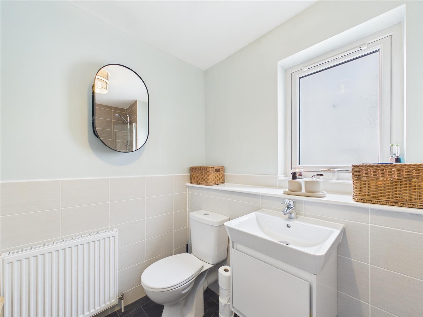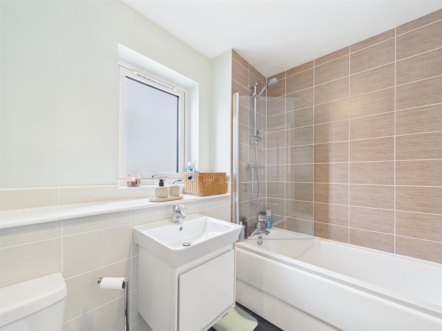 - Bright bathroom with shower over bath